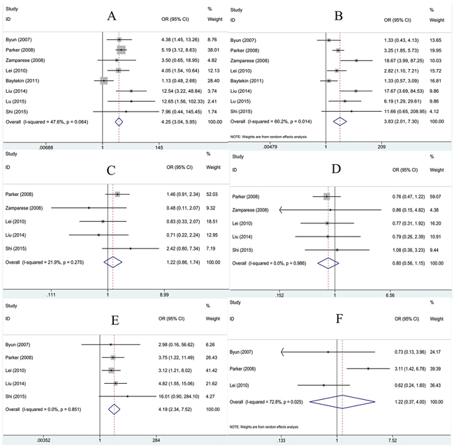 To disclose the significance of survivin in pathological diagnosis, we explored the correlation between survivin expression and clinicopathological characteristics. Data of tumor grade, tumor stage, age, gender, lymph node metastasis and distant metastasis were extracted and then pooled OR and 95% CI were computed. As shown in Figure 2, tumor grade (G3+G4, +) was associated with survivin expression (n=8, OR=4.25, 95%CI: 3.04-5.95, p<0.001) in fixed-effects model analysis. Furthermore, there were association between tumor stage (III+IV,+) (n=8, OR=3.83, 95%CI: 2.01-7.3, p<0.001; I2=60.2%, Pheterogeneity=0.014), lymph node metastasis (yes, +)(n=5, OR=4.19, 95%CI: 2.34-7.52, p<0.001; I2=0, Pheterogeneity=0.851) and survivin expression. However, survivin expression had no association with age (n=5, OR=1.22, 95%CI: 0.86-1.74, p=0.271), gender (n=5, OR=0.8, 95%CI: 0.56-1.15, p=0.224) or distant metastasis (n=3, OR=1.22, 95%CI: 0.37-4, p=0.748). Taken together, the results demonstrated survivin expression in RCC patients could be considered as a significant biomarker for diagnosis of patients with higher grade, advanced stage and lymph node metastasis.