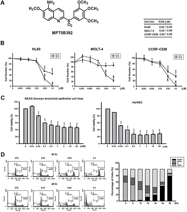 Figure 1: Chemical structure of B392 and its potential anticancer effect in vitro. (A) The chemical structure of B392. (B) Cell viabilities of B392 in HL60 (acute promyelocytic leukemia), MOLT-4 (acute lymphoblastic leukemia), CCRF-CEM (acute lymphoblastic leukemia) and (C) normal cells (BEAS, human bronchial epithelial and HUVEC, human umbilical vein endothelial cell) were determined by MTT assay at 48 h. *P < 0.05, ***P < 0.001, #P < 0.05, ###P < 0.001 compared with the control group. (D) Time (right panel) and concentration-dependent (left panel) of B392 on cell cycle progression. HL60 cells were treated with vesicle (0.1% DMSO) or 0.01, 0.03, 0.1 μM of B392 for 24 and 48 h (left panel) and treated with vesicle (0.1% DMSO) or 0.1 μM of B392 for 6, 12, 18, 24, 36, 48 h (right panel). Cell cycle distribution was performed by flow cytometry. IC50 values were calculated by sigmoidal dose-response equation and expressed as mean plus minus SD at 48 h treatment.