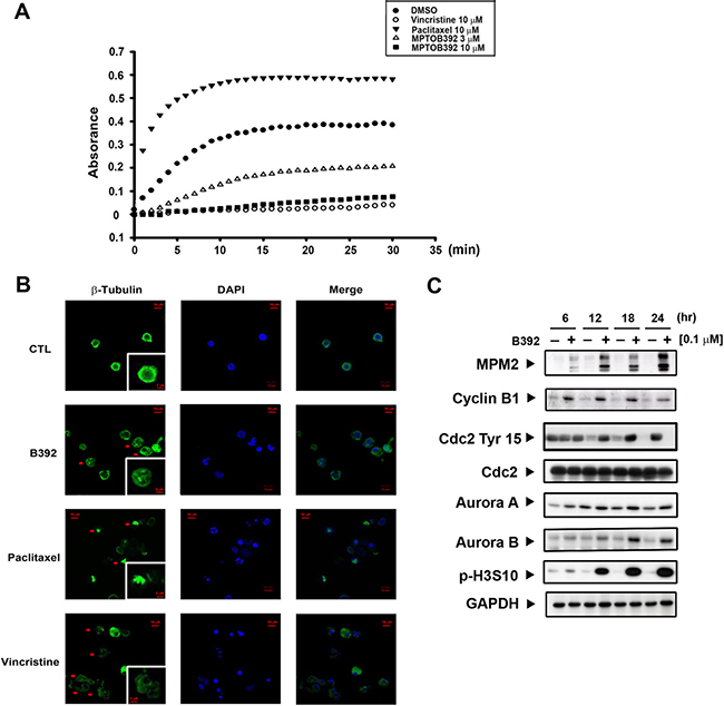 Microtubules play an important role in cell mitosis, and administration of microtubule-binding agents usually result in mitotic arrest [5]. Therefore, we used an in vitro tubulin-polymerization assay as well as tubulin staining (observed using confocal microscopy) to assess whether B392 had an effect on tubulin and would lead to cells accumulation in G2/M phase. As seen in Figure 3A, B392 caused tubulin depolymerization in vitro and disrupted microtubule formation, as observed by diffusion of stained tubulin into the cytoplasm, which phenomena was also shown in vincristine treatment. Paclitaxel and vincristine were utilized as positive controls for tubulin polymerization and depolymerization, respectively (Figure 3B).