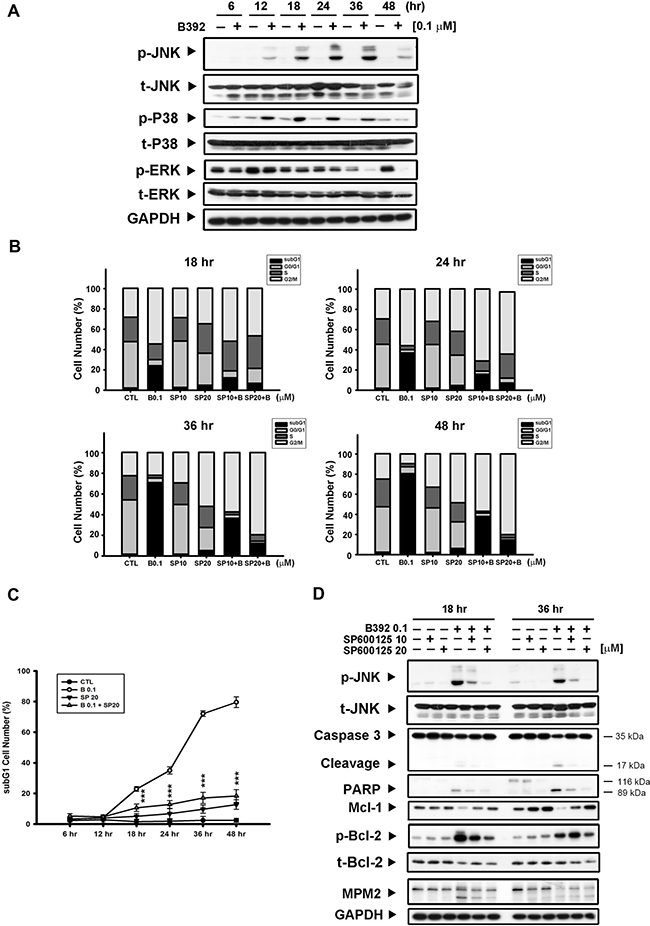 Figure 5: JNK activation was involved in B392-caused cell apoptosis. (A) HL60 cells were treated with vehicle (0.1% DMSO) or B392 (0.1 μM) for time course. The cells were harvested for detection of indicated proteins by western blot analysis. (B) HL60 cells were exposed to B392 (0.1 μM) in the absence or presence of SP600125 (10, 20 μM) for 18, 24, 36 and 48 hours. Cell cycle distribution was analyzed by flow cytometry as well as determining (C) the percentage of subG1 cell number. (***P < 0.001) (D) The expression of indicated proteins was determined after treatment of HL60 with 0.1 μM B392 in the absence or presence of SP600125 (10, 20 μM) pretreatment for 30 min. SP: SP600126, p-JNK inhibitor.