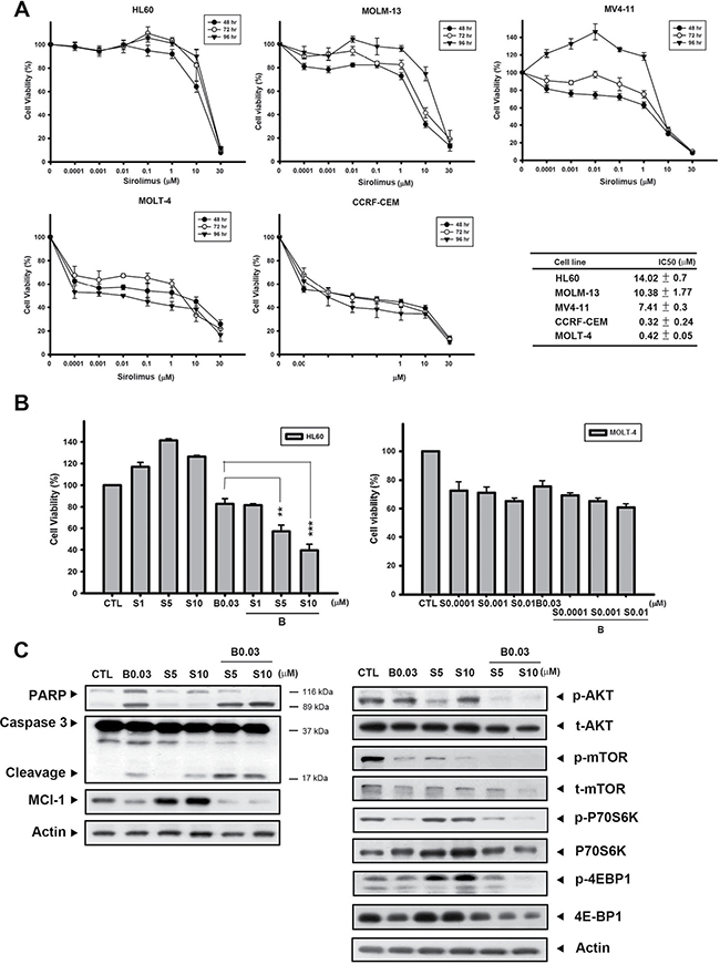 Figure 6: B392 sensitized sirolimus anticancer activity in sirolimus-resistant cell line. (A) Acute myeloid leukemia cell lines (HL60, MV4-11, MOLM-13) and lymphoblastic cell lines (MOLT-4, CCRF-CEM) were treated with indicated concentration of sirolimus for 48, 72, 96 h. The cell viability was determined by MTT assay. The right table summarizes the IC50 of sirolimus at 72 h. IC50 values were calculated by sigmoidal dose-response equation and expressed as mean plus minus SD. (B) The cell viability of B392 combined with sirolimus at 72 h. (C) The expression of caspase 3, PARP, p-AKT, t-AKT, p-mTOR, t-mTOR, p-P70S6K, P70S6K, p-4EBP1, 4EBP, Mcl-1 and actin was determined after 0.03 μM B392 combination with 5 μM or 10 μM sirolimus for 72 h. S: sirolimus **P < 0.01, ***P < 0.001.