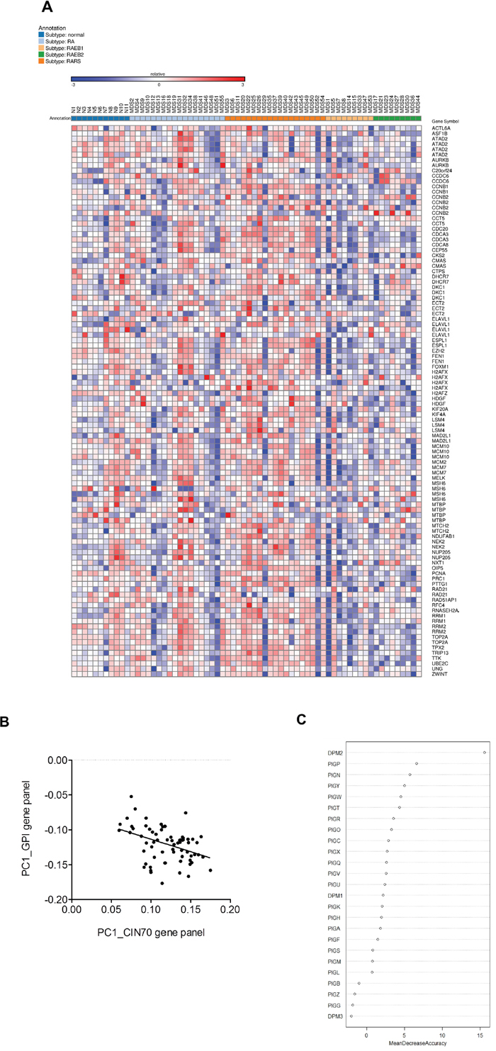 We initially analyzed array data generated from 55 MDS patients and 11 normal controls (GSE4619) [36]. The patients were sub-classified as follows: RA (18 patients), RARS (19 patients), RAEB1 and REAB2 (18 patients). Overall, CIN70 genes were expressed in a MDS disease subtype-dependent manner with a relatively lower expression in high-risk disease subtypes (REAB-1 and RAEB-2) compared to the low risk subtypes (RA and RARS) and normal controls [37]. This gene expression heat map showed that the expression of the CIN70 gene panel was associated with MDS risk stratification (Figure 1A). A randomForest analysis further demonstrated a significant (p = 0.0007) correlation (Pearson r =-0.4068) between the GPI-anchor biosynthesis gene panel and the CIN70 genomic instability marker panel (Figure 1B). Furthermore, the mean decrease in accuracy identified PIGN as highly important (i.e. 3rd ranked) among the GPI-AP biosynthesis genes in predicting MDS progression risk (Figure 1C).