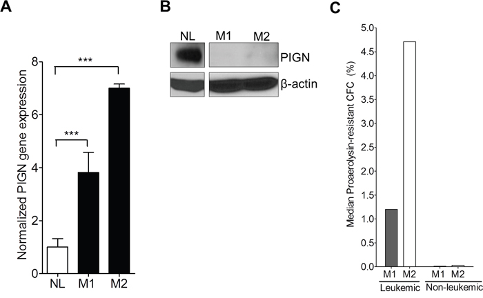 The data from our patient samples, cell lines and existing databases are in line with previous observations that elevated frequency of GPI-AP deficiency is a marker of genomic instability and might predict a risk of leukemic transformation and progression [15–17]. Furthermore, this study indicated that PIGN gene expression aberration may be the key factor linking GPI-AP deficiency with CIN and leukemogenesis. Previous studies demonstrated that, unlike PIGA, PIGN gene loss would not completely eliminate GPI-AP biosynthesis [19, 21]. This piece of data may explain why the leukemic cells from patients M1 and M2 still showed sign of CFC formation reduction in proaerolysin-containing medium though the CFC counts were significantly higher than the normal control.
