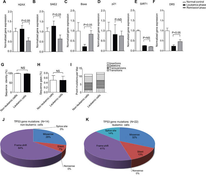 We further explored the role of PIGN gene expression aberration in genomic instability/leukemic progression and the role of the TP53 signaling pathway in the regulation of genomic instability during leukemia progression by studying the leukemic cells from patient M2, and several cell lines. In this patient, TP53 gene deletion was observed in both leukemic cells and non-leukemic cells and manifested with a similar mutation profile, however, the PIGN gene expression aberration only occurred in the leukemic cells. We found that the gene expression of TP53-independent genomic instability/DNA damage markers (H2AX and SAE2) were upregulated and the expression of the pro-apoptosis marker BAXα was downregulated specifically in the leukemic cell-rich mononuclear cells at the active leukemia phase when compared to the cells from the remission phase. However, the expressions of TP53-dependent biomarkers, such as p21 and SIRT1, were not significantly different between the active phase and the remission phase. Furthermore, the expression of the TRAIL death receptor 5 (DR5) was below 50% of that of the normal control in both active phase and the remission phase. We further observed that suppression or elimination of PIGN gene expression in several cell lines and CD34+ mononuclear cells from healthy individuals induced a similar TP53 independent pattern of genomic instability which could be reversed via PIGN gene expression restoration (Figure 6A–6J).