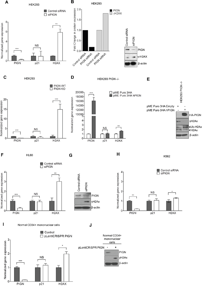 Figure 6: PIGN gene expression suppression was associated with genomic instability; and reintroduction of PIGN gene expression restored genomic stability in a TP53-pathway independent manner. A. PIGN suppression (***p=0.0008) in HEK293 (TP53wt) cells resulted in the upregulated gene expression of H2AX (**p=0.0029) but no significant change (NS) in p21 gene expression. B. PIGN suppression resulted in DNA damage response via a ~50% upregulation of γH2AX transcription and translation in HEK293 cells. C. PIGN deletion (***p< 0.0001) results in a ~15 fold increase (***p=0.0003) in H2AX gene expression but a marginal increase in TP53-dependent p21 gene expression in HEK293 cells. D. Restoration of PIGN in PIGN null (CRISPR/Cas9 deletion) HEK293 cells via transfection of PIGN expression plasmid results in a marked upregulation (i.e. ~400-fold) in PIGN gene expression with a ~1.6-fold increase (**p= 0.0056) of H2AX transcription and no significant (NS) change in p21 gene expression. E. Restoration of PIGN expression in PIGN null HEK293 cells ameliorates genomic instability as indicated by γH2AX suppression while increasing the mono-ubiquitination of H2AX which is critical in the initiation of DNA damage response. F and G. PIGN loss (***p= 0.0003) in HL60 cells (TP53 null) results in a significant (**p=0.0013) upregulation of H2AX in both (F) transcription level and (G) translation level but not (NS) p21 gene transcription. H. PIGN suppression (**p=0.0019) resulted in a marginal increase (*p=0.0387) in H2AX gene expression (NS) but not p21 gene expression (NS) in K562 cells (TP53 inactivation mutation). Above-mentioned data indicated that PIGN suppression/elimination caused genomic instability was independent from TP53-pathway regulation. I. CRISPR/Cas9 ablation (***p<0.0001) of PIGN in normal healthy donor CD34+ mononuclear cells results in a significant (*p=0.0261) upregulation in H2AX transcriptional activation without a significant (NS) increase in p21 transcriptional activation. J. PIGN loss via CRISPR/Cas9 ablation induces upregulation of γH2AX translation in normal healthy donor CD34+ mononuclear cells.