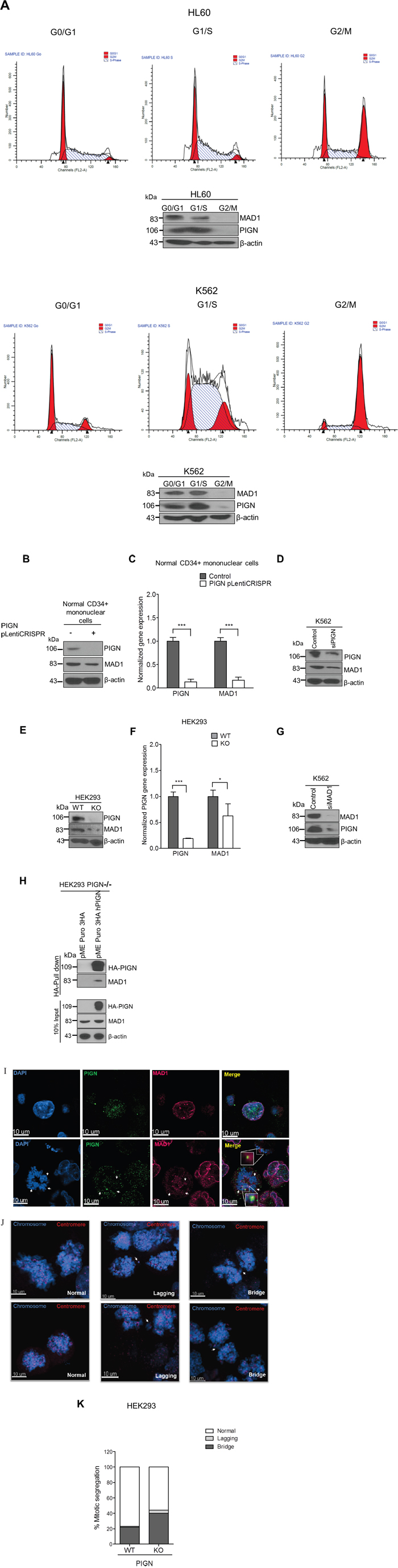 Figure 7: PIGN loss induced chromosomal instability via dysregulation of the spindle assembly checkpoint protein MAD1. A. PIGN and MAD1 were similarly expressed in a cell cycle-dependent manner with suppressed expression in the G2/M phase in HL60 and K562 cells. B. PIGN loss via CRISPR/Cas9 ablation resulted in MAD1 downregulation in normal healthy donor CD34+ mononuclear cells. C. MAD1 gene expression was significantly (***p=0.0007) impacted by PIGN gene loss in normal healthy donor CD34+ mononuclear cells. D. RNAi-mediated PIGN suppression resulted in MAD1 downregulation in K562 cells. E-F. Comparing PIGN wild-type (WT) HEK293 cells and PIGN null (KO) HEK293 cells: PIGN loss is associated with downregulation of MAD1 protein expression and repression (*p=0.0509) of MAD1 gene transcriptional activation. G. MAD1 suppression was accompanied by a corresponding decrease in PIGN protein expression in K562 cells. H. MAD1 directly interacted with PIGN. MAD-1 was co-purified with PIGN in a HA-tag pulldown assay in PIGN null HEK293 cells. Input represents 10% of total protein lysate used in the HA pull down assay. I. Immunofluorescence image of K562 cells showed that PIGN (green) and MAD1(red) had a similar pattern of localization during the mitotic phase and co-localized (yellow) during late prometaphase. White arrows indicate groups of chromosomes in prometaphase. Upper panel: Asynchronous cells; Lower panel: Late prometaphase cells. J-K. PIGN loss in HEK293 cells results in phenotypes associated with chromosomal instability (increased lagging chromosomes and anaphase bridges). J. Representative images of missegregation errors observed in HEK293 cells; Blue (chromosomes) and red (centromere). White arrows indicate lagging chromosomes and positions of anaphase bridges. K. Quantitative analyses of missegregation errors were calculated by counting the numbers of lagging and anaphase bridges observed in a total of 100 cells randomly selected from multiple fields of view.
