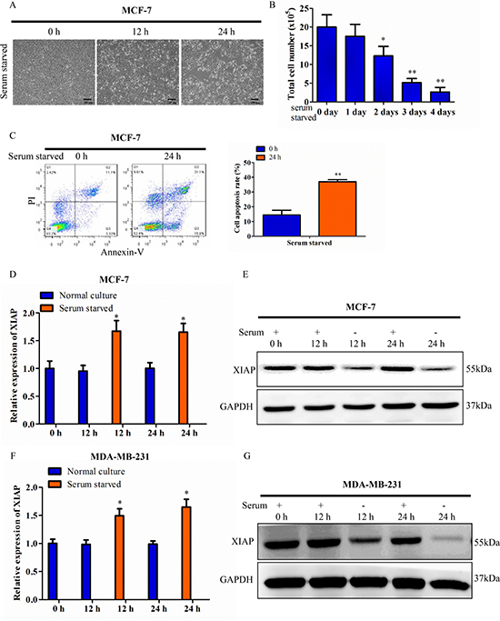 Figure 1: Discrepancy between XIAP mRNA and protein under serum starvation. (A) MCF-7 cells were maintained in tissue culture dishes in serum-free conditions. Cell survival was monitored by light microscopy and photograph. Scale bar, 100 μm. (B) Surviving cells were harvested and counted. (C) MCF-7 cells were cultured in serum-free conditions for 24 h. The cells were stained with Annexin V and PI and analyzed by flow cytometry. (D–E) XIAP expression levels was checked at the transcriptional level by qRT-PCR and western blot. MCF-7 cells were cultured in medium containing 10% FBS (control) or serum starved condition for 12 h or 24 h. (F–G) XIAP expression levels in MDA-MB-231 cells under the condition of 10% FBS (control) or serum deficiency for 12 h or 24 h.