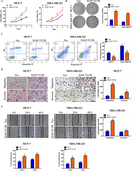 Figure 2: Functional characterization of XIAP 3′UTR in breast cancer cells in vitro. (A) Cells were seeded in 96-well plates (2 × 103 per well) and grown for 5 days for MTT assay. Cell viability MTT assays in MCF-7 cells (left) or MDA-MB-231 cells (right). (B) Colony formation of vector and XIAP 3′UTR construct in MCF-7 or MDA-MB-231 cells. Total colonies numbers were shown on the right panel. (C) XIAP 3′UTR and vector-transfected cells were cultured for apoptosis assay. After being stained with Annexin V and PI, the cells were analyzed by flow cytometry. The XIAP 3′UTR-transfected cells displayed lower level of apoptotic and necrotic cells compared with the control cells. Percentages of apoptosis cells were calculated. (D) Tumor cell migration and invasion assay. MCF-7cells or MDA-MB-231 cells were grown and stably transfected with XIAP 3′UTR or negative control. Cells in the upper chamber were removed and those cells migrated to the lower layer of the inner chamber were stained and counted. Scale bar, 100 μm. (E) Wound healing assay. Wounded areas were examined under ×100 magnification. Scale bar, 100 μm. **P < 0.01.