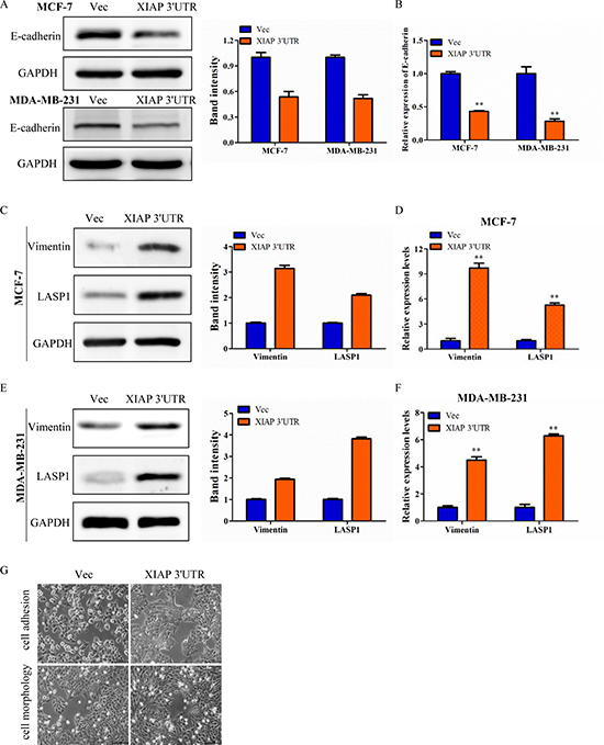 Figure 3: XIAP 3′UTR was associated with EMT features of breast cancer. (A) Western blot analysis of MCF-7 and MDA-MB-231 for E-cadherin protein expression after transfection with XIAP 3′UTR. The relative expression of E-cadherin was normalized to GAPDH. (B) qRT-PCR analysis of E-cadherin in XIAP 3′UTR-treated MCF-7 and MDA-MB-231 cells. (C–F) Expression of Vimentin and LASP1 by western blot (left) and qRT-PCR (right) with overexpression of XIAP 3′UTR. Representative quantitative data of densitometric analyses were shown in middle. (G) Morphology of XIAP 3′UTR cells and control cells. XIAP 3′UTR cells exhibited elongation. Representative pictures were captured using phase-contrast microscopy at 200 x magnification.