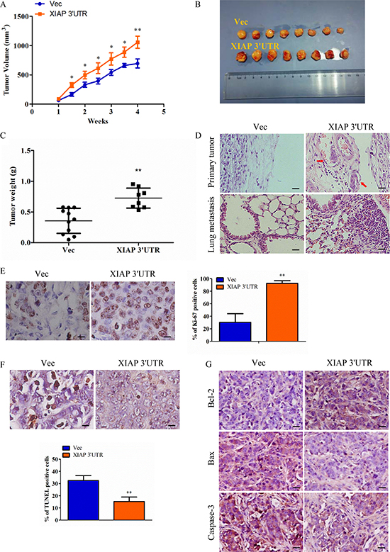 Figure 5: Expression of XIAP 3′UTR enhances tumor growth and metastasis in vivo. (A–B) MCF-7 cells transfected with XIAP 3′UTR or the control vector were injected subcutaneously into BALB/c nude mice. Tumor growth curve (right) and final tumor sizes (left) was monitored for up to 4 weeks, when the tumors reached the limit sizes. (C) Tumor weight. The terminal tumor weight was plotted for each treatment group. Significantly higher tumor weight in mice injected with XIAP 3′UTR versus control cells. (D) Sections from primary tumors and lungs were examined. Tumor cell invasion is shown in the top panel and pulmonary micro-metastases are shown in the bottom panel. The arrows indicate metastatic tumor foci. Scale bar, 50 μm. (E–F) Cell proliferation as measured by Ki-67 staining and cell apoptosis as measured by TUNEL staining of tumors derived from MCF-7 XIAP 3′UTR or MCF-7 Vec cells. Scale bar, 10 μm. (G) IHC was used to determine the expression levels of apoptosis markers which are Bcl-2, Bax and caspase-3 in mouse orthotopic tumor tissues. Scale bar, 25 μm. *P < 0.05, **P < 0.01.