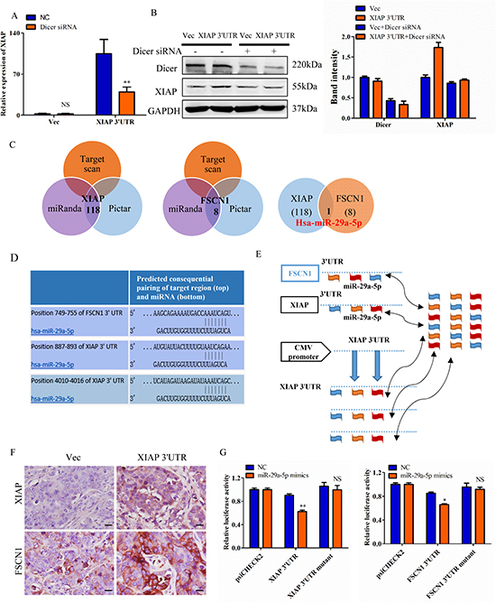 Figure 6: XIAP 3′UTR interacts with miRNAs and regulates expression of associated genes. (A) MCF-7 cells were transfected with XIAP 3′UTR and/or siRNA of Dicer. mRNA level of XIAP was increased in the absence of Dicer siRNA but decreased with Dicer siRNA. (B) The protein level of XIAP and Dicer were detected in MCF-7 cells transfected with XIAP 3′UTR combined with or without Dicer siRNA. Representative quantitative data of densitometric analyses were shown on right. (C) Schema of the candidate genes predicted by different prediction methods. Each circle represents thenumber of genes identified by one algorithm. miR-29a-5p was listed in the overlap of three circles are simultaneously predicted by different algorithms. (D) Predicted miR-29a-5p binding sites in the 3′UTR of XIAP and FSCN1. (E) Hypothesis that overexpression of XIAP 3′UTR would bind endogenous miR-29a-5p and thus free XIAP and FSCN1 mRNAs for translation. (F) Tumor sections were immunohistochemically stained with antibody against XIAP and FSCN1. XIAP 3′UTR sections showed higher levels of these proteins than the control sections. Scale bar, 25 μm. (G) MCF-7 cells were co-transfected with miR-29a-5p mimics and the luciferase constructs or a mutant constructs, in which the miRNA target sites were mutated. A non-related fragment of complementary DNA was used as a positive control. *P < 0.05, **P < 0.01, NS, not significant by the Student’s t-test.