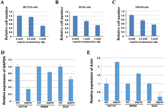 Figure 1: Screening the doses of aspirin to identify the reference genes in colon cancer cells treated with aspirin. (A) Screening the dose of aspirin in HCT116 cells by detecting its inhibitory effect on cell proliferation. (B) Screening the dose of aspirin in DLD1 cells by detecting its inhibitory effect on cell proliferation. (C) Screening the dose of aspirin in SW620 cells by detecting its inhibitory effect on cell proliferation. (D) Detection of the expression of GAPDH in three colon cancer cell lines treated with aspirin. E. Detection of the expression of β-actin in three colon cancer cell lines treated with aspirin.