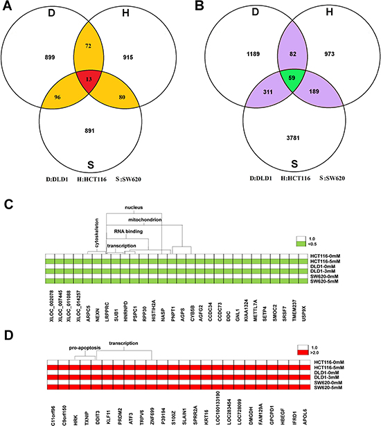 Figure 2: Screening candidate reference genes for normalizing mRNA expression in aspirin treated colon cancer cells. (A) Thirteen stably expressed genes were screened as the candidates of the internal reference genes by using microarray. (B) There are totally 59 transcripts significantly changed in three cell lines after aspirin treatment. (C) The commonly down-regulated mRNA in three cell lines after aspirin treatment. (D) The commonly up-regulated mRNA in three cell lines after aspirin treatment.