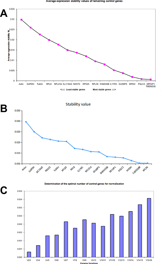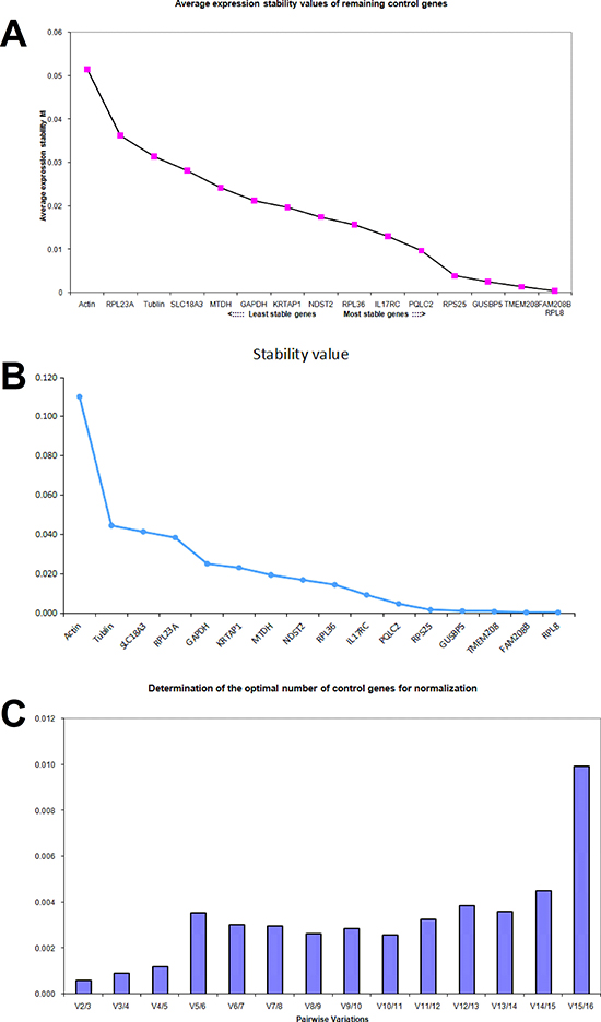 Figure 5: Identifying reference genes for normalizing mRNA expression in aspirin treated HCT116 cells. (A) Identifying reference genes by using geNorm software. (B) Identifying reference genes by using NormFinder software. (C) Optimizing the number of reference genes in aspirin treated HCT116 cells.
