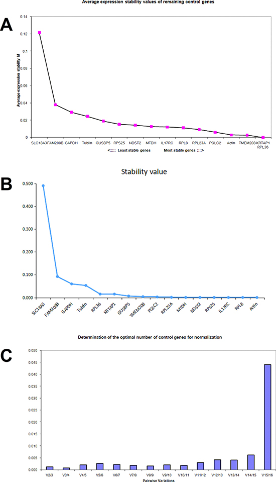 Two analysis softwares, geNorm (https://genorm.cmgg.be/) and NormFinder V19 (http://moma.dk/normfindersoftware; Department of Molecular Medicine, Aarhus, Denmark), were used to identify the stable reference genes. The data were presented as the mean ± SD. Comparisons between the groups were analyzed by Chi-square test, Student’s t test or One-Way ANOVA analysis. P < 0.05 was defined as statistically significance.