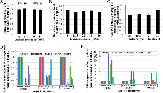 Figure 6: Validation of TMEM208 and PQLC2 as ideal reference genes in colon cancer cells. (A) Validation of TMEM208 and PQLC2 as ideal reference genes in SW480 and SW1116 cells. (B) Changing the concentrations of aspirin does not alter the expression of TMEM208 and PQLC2. (C) aspirin treatment does not affect the mRNA decay of TMEM208 and PQLC2. (D) Validation of the down-regulated genes in three colon cancer cells treated with aspirin using PQLC2 as internal reference gene. (E) Validation of the up-regulated genes in three colon cancer cells treated with aspirin using PQLC2 as internal reference gene.