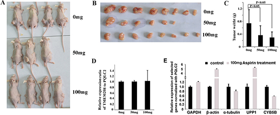 Figure 7: Validation of TMEM208 and PQLC2 as the ideal internal reference gene in xenograft of colon cancer treated with aspirin. (A) The illustration of nude mice bearing colon cancer subcutaneously. (B) The illustration of tumors with and without aspirin treatment. (C) aspirin treatment significantly decreased the weight of tumor xenografts in vivo (p < 0.05). (D) The expression of TMEM208 and PQLC2 is not altered in the xenografts of colon cancer after aspirin treatment. (E) The relative expression of several selected genes (three traditional reference genes and two novel identified target genes of aspirin) in the xenografts treated with aspirin (100 mg) normalized with PQLC2.