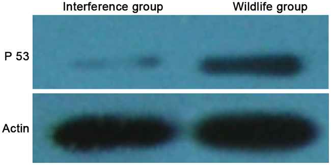 The WB result showed that the expression level of p53 protein in the interference group was significantly lower than that in the wild group (showed as Figure 1). It showed that the expression level of P53 protein in HepG2 cells was significantly decreased by the recombinant P53 siRNA, and the cell strain with a low expression level of P53 was successfully constructed.