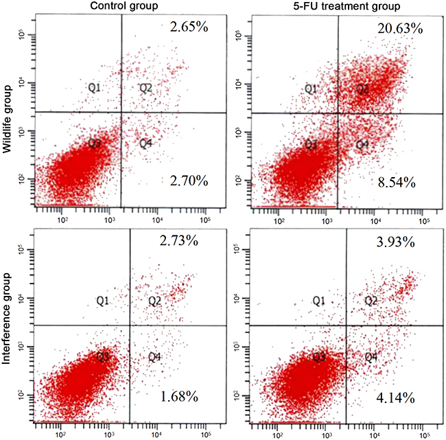 The wild HepG2 cell suspension and siRNA HepG2 cell suspension with a low expression level of p53 were inoculated on the 6-well plate (5×105/well). When the fusion was 80%, 200 μg/mL 5-FU was added into each well. 48h after incubation, the apoptosis rate was detected by FCM.