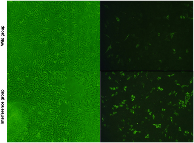 The result of the immunofluorescence showed that, when the amount of the cells was equally the same between the groups at 24h after DV infection, more virus antigens were found around the nucleus. And the amount of green fluorescent cells in the interference group was significant higher than that in the wild group (showed in Figure 4). It indicated that the virus multiplication was promoted by the low expression level of P53 in the interference group