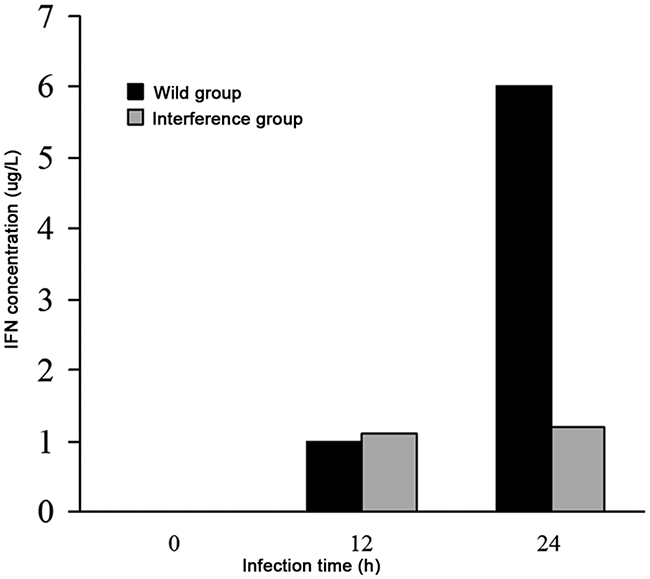 The result showed that at 12h after DV infection, there was no difference in the levels of IFN-β in the wild group and the interference group. At 24h after DV infection, the level of IFN-β was 6 μg/L in the wild group, however, the level of IFN-β in the interference group kept unchanged (shown in Figure 6). It indicated that the secretion of the interferon in the virus infected cells was promoted by the high expression level of P53, and the interferon played an antiviral role at the early stage of virus infection.
