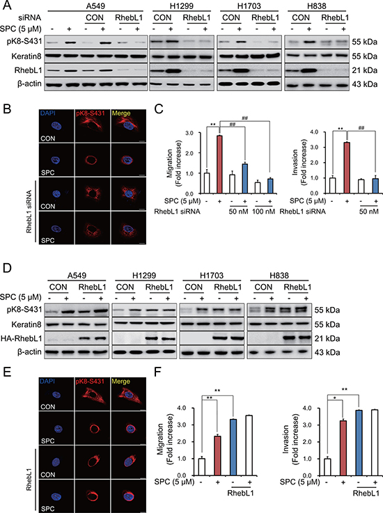 Gene silencing of RhebL1 suppressed the SPC-induced K8 phosphorylation and reorganization (Figure 2A, 2B) and ectopic expression of RhebL1 induced SPC-induced K8 phosphorylation and reorganization (Figure 2D, 2E). Furthermore, gene silencing of RhebL1 inhibited the SPC-induced migration and invasion and overexpression of RhebL1 increased the migration and invasion, even without SPC treatment (Figure 2C, 2F).