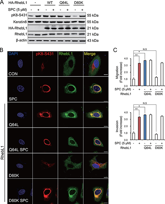RhebL1 has G protein activity [31]. So, we examined whether G protein activity of RhebL1 could increase SPC-induced K8 phosphorylation. Glutamine (Q) 64 of RhebL1 was site-directed mutated to leucine (Q64L) as the active form in which GTP is constitutively bound and aspartic acid (D) of RhebL1 to lysine (D60K) as the dominant negative form [32] which cannot bind to GTP. K8 phosphorylation was induced by overexpression of RhebL1Q64L but not by D60K without SPC treatment in A549 cells (Figure 3A). K8 reorganization was also induced by overexpression of RhebL1Q64L but not by D60K without SPC treatment in A549 cells (Figure 3B). RhebL1Q64L overexpression enhanced migration and invasion of A549 lung cancer cells without SPC treatment (Figure 3C). These results suggest that G protein activity of RhebL1 is related to SPC-induced K8 phosphorylation and reorganization leading to migration and invasion of A549 cells.