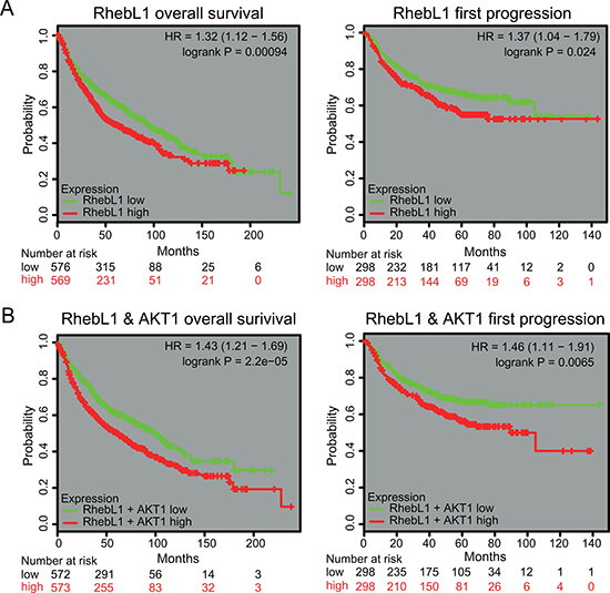 Figure 6: Effects of expression RhebL1 or RhebL1 & AKT1 on the prognosis of lung cancer patients. (A) Effects of RhebL1 expression on survival of lung cancer patients. Overall survival curves were shown between RhebL1-high and RhebL1-low in lung cancer patients (left panel, n = 1145). Progression free survival curves between RhebL1-high & AKT1-high and RhebL1-low & AKT1-low in lung cancer patients (right panel, n = 596) are shown. (B) Effects of RhebL1 and AKT1 expression on survival of patients with lung cancer. Overall survival curves between RhebL1-high & AKT1-high and RhebL1-low & AKT1-low in lung cancer patients (n = 1145) are shown in the left panel. Progression free survival curves between RhebL1-high & AKT1-high and RhebL1-low & AKT1-low in lung cancer patients (n = 596) are shown in the right panel.