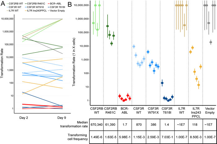 Figure 3: Ba/F3 transformation rates vary by transgene but not by time in culture. A. Transformation rates calculated for each biologically replicate cell line are shown for plates started 2 days and 9 days after retroviral infection. The transformation rate is expressed as 1 in X cells capable of transforming to IL-3 independent growth, therefore a higher transformation rate indicates a weakly transforming cell line. No consistent trend is observed between days post-infection and transformation rate. B. Transformation rate and 95% confidence intervals for every replicate. The median rates across biologically replicate samples are shown below, along with the frequency of transforming cells (inverse of transformation rate). Lines that exhibited no observable transformation are shown with a rate of 1.0x107.