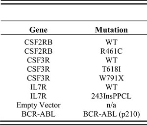 Three cytokine receptors harboring four unique oncogenic mutations along with wild type control receptors were selected for this study based upon their well-established transformation capability (Table 2). CSF2RB R461C is a germline mutation found in a T-ALL patient and shown to activate ligand-independent signaling in vitro [30]. CSF3R T618I is a prominent mutation in CNLs and aCMLs and leads to ligand-independent activation [33]. CSF3R truncation mutations (including W791X) have also been reported in both CNL and aCML [33], resulting in surface receptor accumulation through altered endocytosis and degradation [34, 35]. IL7R 243InsPPCL was described in a B-ALL patient [36] and is one of a group of mutations in pediatric ALLs that activate IL7R by introducing unpaired cysteine residues in the membrane-proximal region of the receptor that cause constitutive dimerization [37]. Expression of BCR-ABL fusion or empty vector served as positive and negative controls, respectively, for transformation of Ba/F3 cells in our assays.