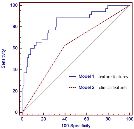 Figure 1: Comparisons of ROC curves of two logistic regression models derived from texture features (Model 1), and clinical feature (Model 2) for the prediction of pathologic grade. The model generated with texture features (Model 1, AUC = 0.834) was superior to the model with clinical variable (Model 2, AUC = 0.615). There was significant difference in AUCs between these two models (P = 0.0001).