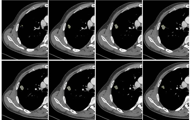 Chest CT examinations were performed by using one of three MDCT systems: Somatom Sensation 64 (Siemens Medical Solutions, Forchheim, Germany), Light speed 16 (GE Medical Systems, Milwaukee, WI), and Discovery CT750 HD scanner (GE Medical Systems, Milwaukee, WI). For the 64-detector scanner, scanning parameters were as follows: 120 kVp with tube current adjusted automatically; pitch of 0.969; reconstruction thickness, 1.5 mm; reconstruction interval, 1.5 mm. For the 16-detector scanner and Discovery CT750 HD scanner, scanning parameters were as follows: tube voltage, 120 kVp; tube current, 150-200 mA; beam pitch, 0.969; reconstruction thickness, 1.25 mm; reconstruction interval, 1.25 mm. All of the patients underwent contrast-enhanced CT scan. Images were obtained after intravenous administration of 80 - 100 mL of non-ionic iodine contrast material (Ultravist, Bayer Pharma, Berlin, Germany; Omnipaque, GE Company, Shanghai, China) at a rate of 2.5 mL/sec using an automated injector. The CT scanning was performed with a 70-second delay. All CT scans were obtains in the supine position during breath holding at the end of full inspiration. Image resolution was determined by pixel spacing, and each case had the same image resolution.