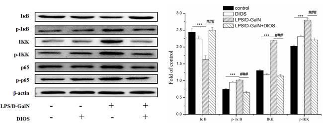 Figure 7: Effect of DIOS on the NF-KB signaling pathway after administration of LPS/D-GalN endotoxin. All data are presented as means ± SD (n = 10). ***P < 0.01 vs control group; ###P < 0.01 vs LPS/D-GalN group.