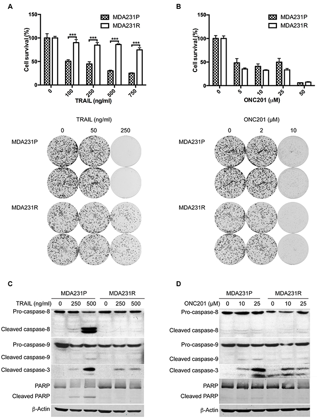 Figure 1: ONC201 induces apoptosis in TRAIL-sensitive and -resistant MDA231 cells. MTT and colony formation analyses of MDA231P and MDA231R cells treated with TRAIL A. or ONC201 B. For MTT assays, MDA231P and MDA231R cells were left untreated or treated with 100, 250, 500, 750 ng/ml TRAIL or 5, 10, 25, 50 μM ONC201 for 72 h. For colony formation assays, 500 cells/well were seeded in 6-well plates. The next day, cells were left untreated or treated with 50, 250 ng/ml TRAIL or 2, 10 μM ONC201 for 72 h and then grown in medium without TRAIL or ONC201 for 12 days, followed by crystal violet staining. Data represent mean ± S.D. (error bars) of three independent experiments. ***, p<0.001, statistically significant. Western blot analyses of caspase-8, caspase-9, caspase-3 and PARP, treated with TRAIL C. or ONC201 D. MDA231P and MDA231R cells were left untreated or treated with 250 and 500 ng/ml TRAIL for 24 h or 10, and 25 μM ONC201 for 72 h. β-Actin was used as a loading control.