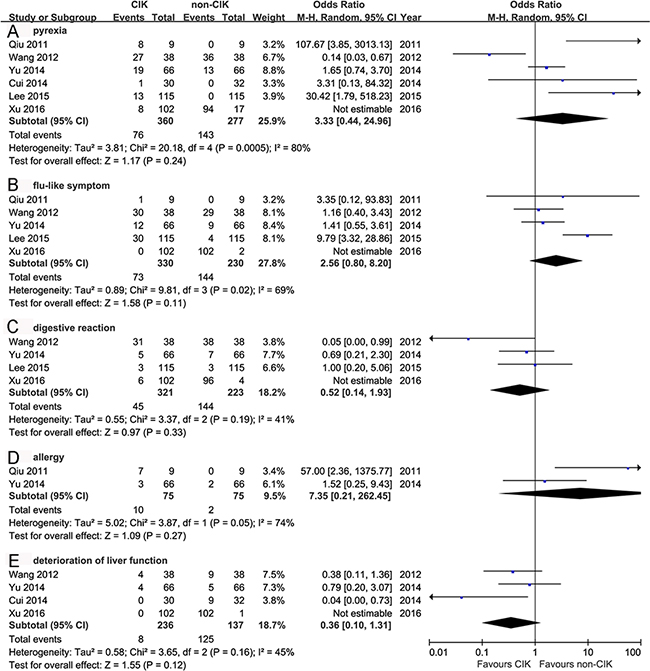 Figure 4: Comparison of the adverse events between CIK group and non-CIK group. The random-effects meta-analysis model (Mantel-Haenszel method) was used in this analysis.