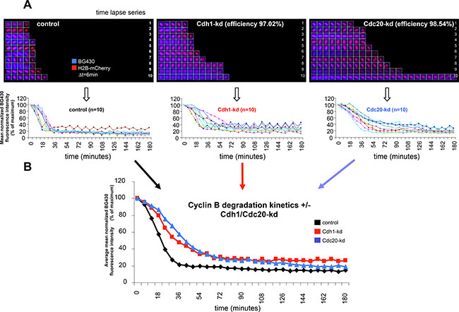 Figure 1: Effect of Cdh1- and Cdc20-kd on cyclin B degradation kinetics in unperturbed single cells. (A) Unperturbed BG430-stained CYS cells were followed by live-cell imaging at the single cell level. Time-lapse series depict chromatin (in red) and abundance of BG430-bound cyclin B-YFP-SNAP protein (in blue) in individual CYS cells during mitosis (see upper panels). Cyclin B-YFP-SNAP degradation kinetics as derived from the shown n = 10 individual CYS cells are presented in the diagrams below the time-lapse series. Time-lapse series and degradation curves to the left are derived from control cells. Time-lapse series and degradation curves in the center are derived from CYS cells following Cdh1-kd with a calculated kd efficiency of 97.02%. Time-lapse series and degradation curves to the right are derived from CYS cells following Cdc20-kd with a calculated kd efficiency of 98.54%. (B) The diagram shows averaged cyclin B degradation curves (data are derived from the cells shown in (A)) of control cells (black line), Cdh1-kd cells (red line) and Cdc20-kd cells (blue line).