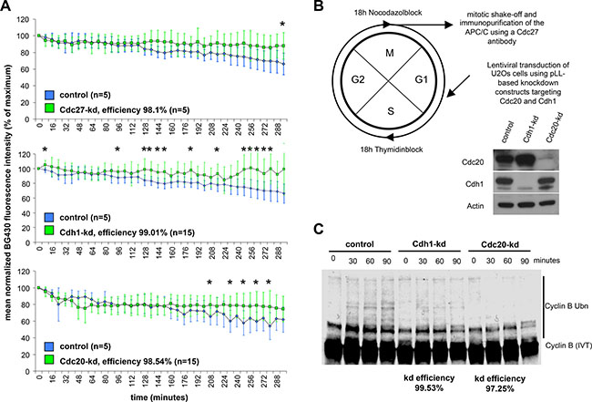 Figure 2: Slow degradation of cyclin B during a mitotic block is influenced by the activating APC/C subunits Cdc20 and Cdh1. (A) Cyclin B-YFP-SNAP degradation kinetics in U2Os cells during a nocodazole-induced mitotic block are shown. Degradation kinetics at the single cell level in the presence of a Cdc27-kd (squares filled in green) compared to control cells (rhombs filled in blue) are shown in the upper diagram. Degradation kinetics in the center reveal the effect of a Cdh1 knockdown (squares filled in green) while degradation kinetics in the lower diagram show the difference between Cdc20-kd cells (green squares) and control cells (blue diamonds). Calculated kd efficiencies are listed in the lower right part of each diagram. The control degradation curves in the upper and center diagram are identical since the data for the Cdc27-kd-, Cdh1-kd- and control curves are derived from the same experiment. * indicates p < 0.05 at the indicated time point. (B) The scheme in the upper left indicates the processing of cells prior to harvest for the in vitro ubiquitination assay. Western Blot below the scheme indicates the efficacy of the Cdh1- and Cdc20-kd. (C) Autoradiogram to the lower right shows the abundance of ubiquitylated cyclin B at the indicated time points following incubation with APC/C, which was immunopurified from synchronized kd and control cells during mitotic block. Calculated kd efficiencies (based on the Western Blot above) are shown below the autoradiogram.