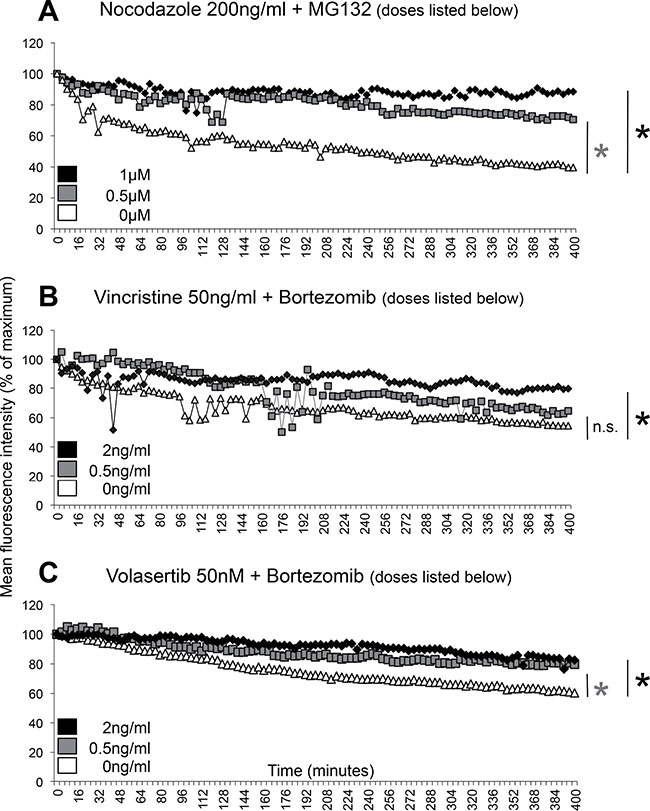 Figure 3: Therapeutic doses of bortezomib reduces slow cyclin B degradation during a mitotic block. Cyclin B degradation slopes as determined by live-cell imaging of individual U2Os cyclin B-SNAP clone 11 cells during a mitotic block are shown. (A) U2Os cyclin B-SNAP reporter cells were treated with 200 ng/ml nocodazole to induce a stable mitotic block and MG132 at 0 μM (white triangles), 0.5 μM (grey squares) and 1 μM (black diamonds). (B) U2Os cyclin B-SNAP reporter cells were treated with 50 ng/ml vincristine to induce a stable mitotic block and bortezomib at 0 ng/ml (white triangles), 0.5 ng/ml (grey squares) and 2 ng/ml (black diamonds). (C) U2Os cyclin B-SNAP reporter cells were treated with 50 nM volasertib to induce a stable mitotic block and bortezomib at 0 ng/ml (white triangles), 0.5 ng/ml (grey squares) and 2 ng/ml (black diamonds). Degradation slopes represent mean values derived from 3 individual representative cells undergoing a mitotic block. *p < 0.05, at t = 400 min.