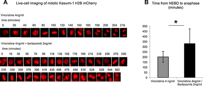 To this end, Kasumi-1 cells stably expressing H2B-mCherry as a chromatin marker were followed via live-cell imaging and the time between nuclear envelope breakdown (NEBD) and chromosomal segregation was quantified. When challenged with 4 ng/ml vincristine, a concentration seen in patient serum following application of a therapeutic dose of 2 mg i.v. [30], Kasumi-1 cells exhibited a mitotic delay, yet still managed to segregate their chromosomes (Figure 4A, upper panel). This mitotic delay was significantly prolonged by approximately 1.5-fold when we used vincristine in combination with the proteasome inhibitor bortezomib at the therapeutic dose of 2 ng/ml (Figure 4A lower panel and Figure 4B).