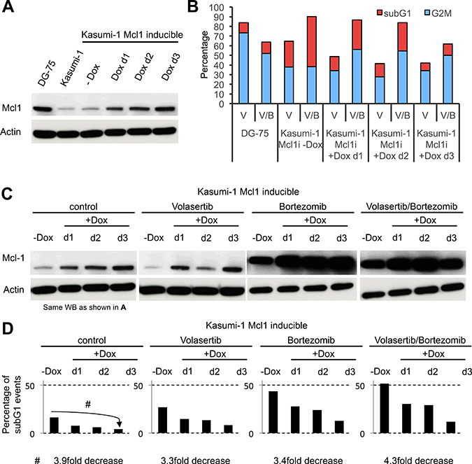 Figure 6: Bortezomib-induced stabilization of Mcl-1 does not protect Kasumi-1 cells from therapy-induced cell death. (A) Western Blot illustrating the protein expression levels of Mcl1 in lymphoblastic DG-75 cells, myeloblastic Kasumi-1 cells and Mcl1-inducible Kasumi-1 cells +/− induction of Mcl1 expression by doxycycline. (B) Diagram indicating the percentage of cells undergoing mitotic delay (G2/M phase; blue) and dead cells (subG1; red) in DG75 cells and Mcl1-inducible Kasumi-1 cells. (C) Western Blot illustrating the expression levels of Mcl1 in Mcl-1-inducible Kasumi-1 cells. Note that the Western Blot to the left is the same one as shown in (A), except that the bands for DG-75 and Kasumi-1 wild type cells are not shown. (D) Diagrams illustrate the extent of cell death of Mcl1-inducible Kasumi-1 cells as determined by the percentage of subG1 events upon induction of Mcl1 overexpression for the indicated times and in the presence of the indicated drug treatments.
