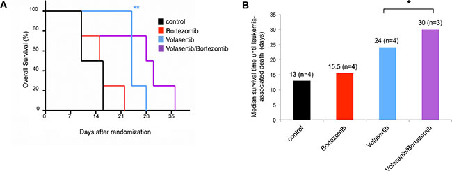 Figure 7: Bortezomib in combination with volasertib induces improved disease control in a xenotransplant mouse model of human AML. (A) Kaplan Meier curves as determined for xenotransplant mice bearing human Kasumi-1-derived AML upon treatment as indicated in the upper right. n = 4 mice per cohort. (B) Diagram shows median survival time until leukemia-associated mortality. *p < 0.05, **p < 0.01.