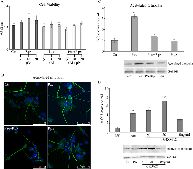 Acetylated α-tubulin was assayed also by western blotting analysis. In Figure 2C, the western blotting and densitometric analyses for this marker are reported. In agreement with the morphological data, paclitaxel determines a significant increase of acetylated α-tubulin, while under combined treatments the protein appears at the same level of control cells. In order to determine whether the observed effects may be triggered by the CXCR2 natural ligand, GRO/KC, which is thought to play a role in the rat similar to that played by IL-8 in humans, was used. Acetylated α-tubulin was re-assayed by western blotting under GRO/KC treatment at different concentrations (Figure 2D), and compared to paclitaxel treatment. It is possible to observe that GRO/KC is able to increase acetylated α-tubulin at each concentration used.