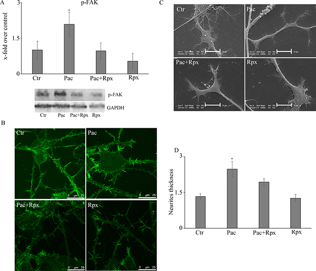Figure 3: (A) Western blotting analysis for the active form of the protein of fokal adhesion, p-FAK. In panel (B) the localization for the cytoskeletal component actin on control and treated cells is reported. The SEM analysis were also performed and reported in panel (C). By the mean of actin localization also neurite thickness was calculated (panel D). Data are mean ± SE of 3 different experiments. *p < 0.05; Bar = 25 μm.