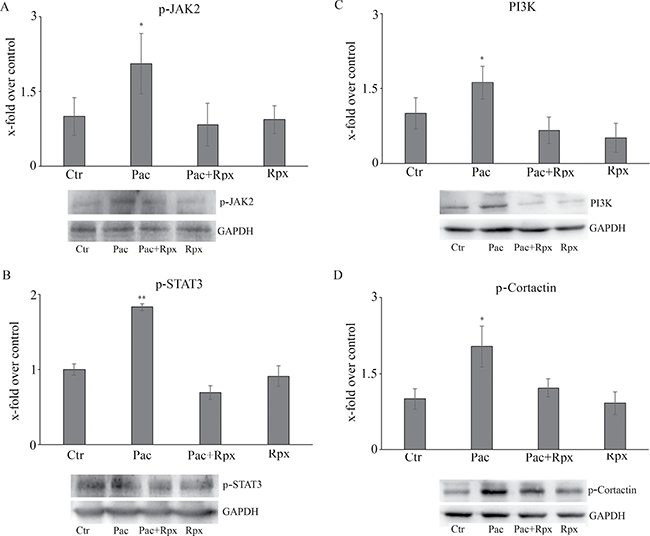 The subsequent experiments were performed in order to dissect the signal transduction pathways, under GRO/KC control, eventually modulated by paclitaxel and/or reparixin (Figure 3). To this purpose the first enzyme studied was the active form of the protein of fokal adhesion, p-FAK. The protein is significantly increased by paclitaxel treatment, while under combined treatments it appears at the same level of control cells (Figure 3A).