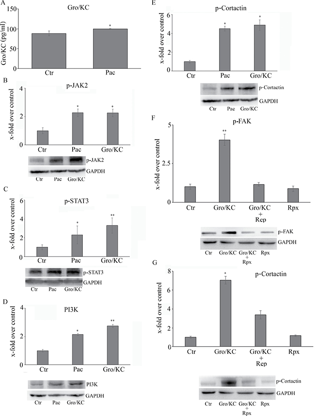 Figure 5: (A) GRO/KC 5 levels released into the culture medium, quantitated by ELISA assay The whole CXCR1/CXCR2-mediated pathway re-assayed in the presence of GRO/KC in the place of paclitaxel is shown in Panels (B–E). The effects of reparixin on GRO/KC-induced p-cortactin and p-Fak is reported in Panels (F and G). Data are mean ± SE of 3 different experiments. *p < 0.05; **p < 0.005.