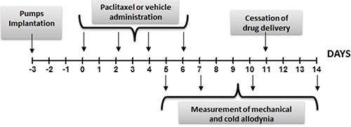 Rats received four once daily i.p. injections of paclitaxel (2 mg/kg/day; cumulative dose of 8 mg/kg; Tocris, Italy) or vehicle (15% PEG400, 5% Tween80 and saline, 1ml/kg/day), administered on alternate days (day 0, 2, 4, and 6) as described [9]. Behavioral testing was performed prior to paclitaxel/vehicle administration (day -1) in order to determine the basal values of the mechanical and cold nociceptive thresholds, and again on day 5-7-10-14 following paclitaxel/vehicle injection. as shown in the scheme above.