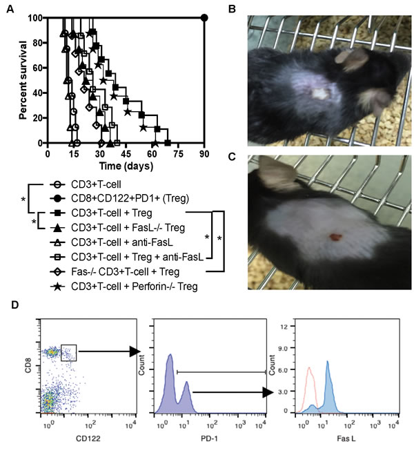 Figure 1: FasL/Fas pathway plays an important role for CD8+CD122+PD-1+ Treg-mediated suppression of skin allograft rejection. (A.) Shown is skin allograft survival after various treatments. Rag1-/- mice (B6 background) were transplanted with a piece of Balb/C skin and received syngeneic CD3+ T cells (n = 8), CD8+CD122+PD-1+ Tregs (n = 8) or both (n = 9) with a Treg/Teff ratio of 1:4. Some recipients received the Tregs derived from FasL-/- (n = 8) or Perforin-/- mice (n = 8) while others received T cells as effectors from Fas-/- (lpr) mice (n = 7). Additional recipients were also treated with a blocking anti-FasL antibody (n = 7). (*P < 0.05, n = 7-9). (B. & C.) One representative of accepted or rejected skin allograft is shown. (D.) CD8+CD122+PD-1+ Tregs isolated from naïve B6 mice mostly expressed FasL prior to their adoptive transfer, as determined by flow analyses. One of two separate flow data is shown.