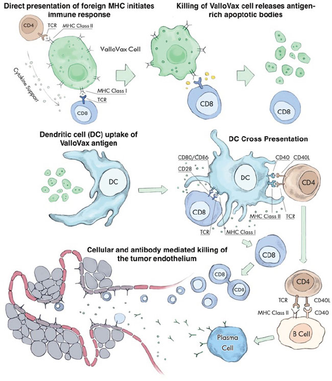 Figure 1: Multiple steps in the ValloVax-induced immune response. Initial recognition of MHC expressed on the ValloVax cell induces antigen presentation via indirect recognition. Engulfment of apoptotic bodies released from the ValloVax cells in the process of phagocytosis. Cross presentation of ValloVax antigens, inducing an antigen-specific cellular and humoral immune response. The homologies between angiogenesis targets expressed on the ValloVax cell and tumor endothelium result in a cross reaction where the immune response spreads to induce killing of the tumor vasculature.
