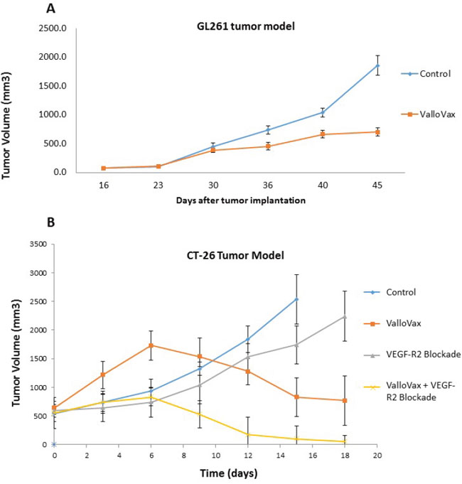 Figure 2: Efficacy of ValloVax across histologically distinct tumors. GL-261 A. or CT-26 B. tumor cells were inoculated at time of vaccination or 10 days prior to vaccination, respectively, at a concentration of 1.7 x 10(6) or 5 x 10(5) cells per mouse. For GL-261 experiments, ValloVax was administered weekly, whereas for CT-26 experiments, vaccination was administered at day 10 post tumor inoculation and day 17. Tumor growth was assessed at the indicated timepoints.