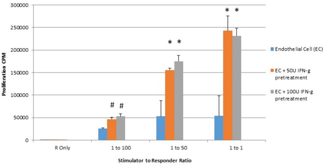 Stimulator cells where placental endothelial cells that were treated for 48 hours with dilution buffer (control) 50 or 100 IU interferon gamma and mitotically inactivated by irradiation at 10 Gy. Cells were plated at the indicated stimulator:responder ratio, with 100,000 stimulators in round bottom 96-well plates and cultured for 72 hours with 1uC of tritiated thymidine added at the last 8 hours of culture. Proliferation was quantified by counts per minute.